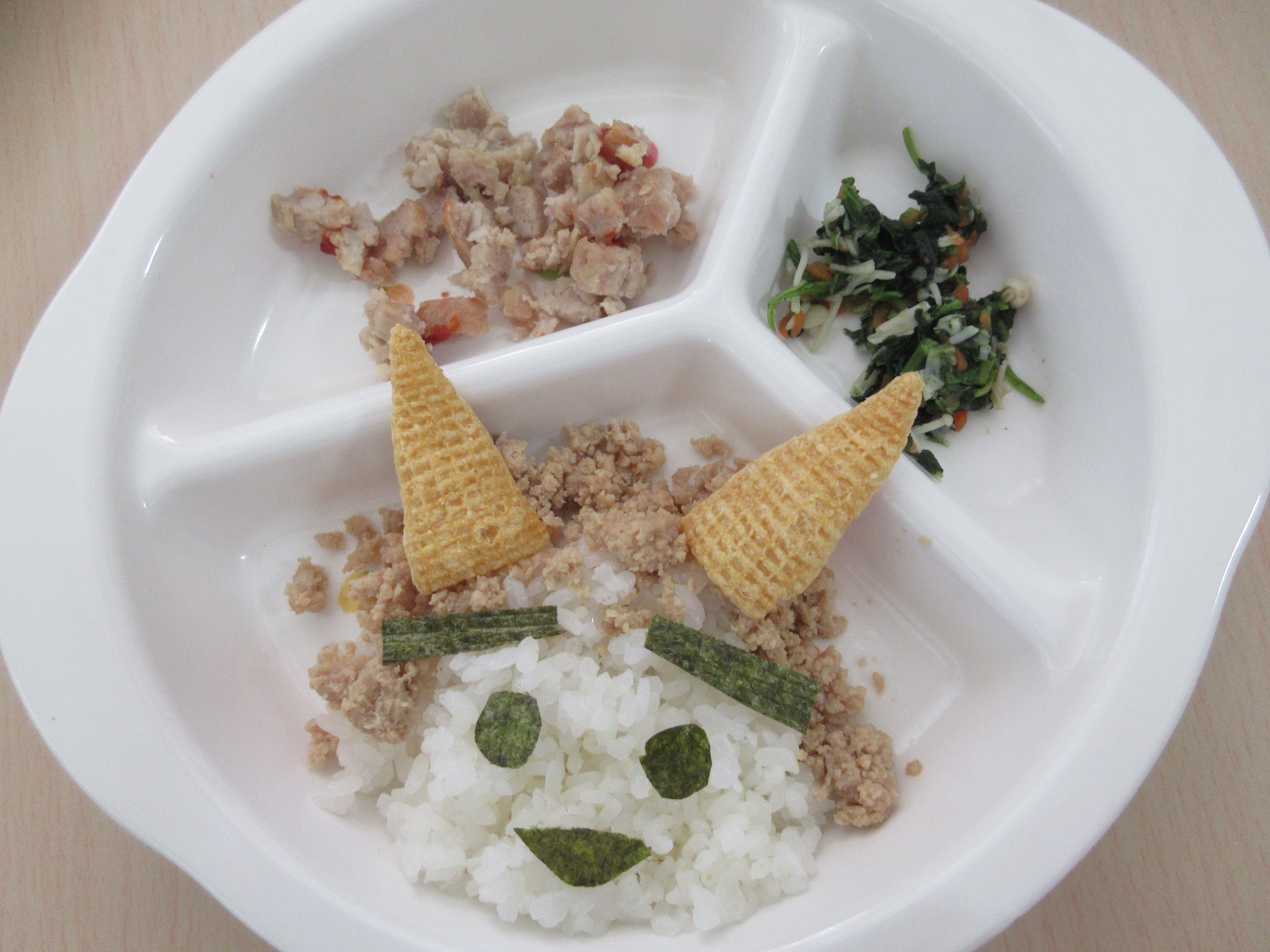 給食には、おおしか保育園で作っていただいた、おいしい鬼さんのごはん。たくさん食べて、心も体のなかも悪い鬼をやっつけて、これからも元気に過ごせますように。 玄関には、鬼(災い)が、迷って入ってこないように、『立春大吉』のお札を飾りました。